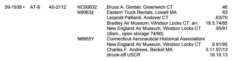 The AT-6A, (ed. note: 40-2112), N90632 was sold. I believe it had been involved in a landing accident in Willimantic and was donated to NEAM many years ago.