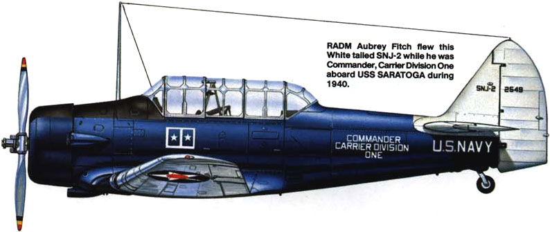 The second painting “Brown Shoe Navy” was chosen to highlight the pride of the prewar Navy and depict not only SNJ-2 BuNo 2549, but also Admiral Fitch’s other assigned aircraft SB2U-2 BuNo 1343 as well as his flag ship USS Saratoga (CV-3). We chose the same colors as the first painting but revised the size of the wing insignia to prewar and this time showed the distinctive “admiral stars” that could be inserted into a special holder on each fuselage side.