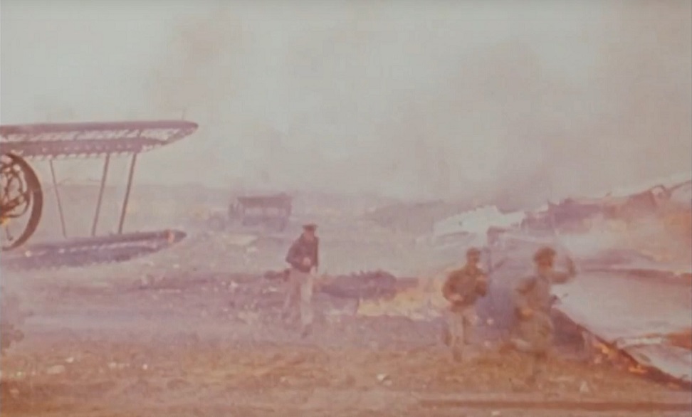 This footage was taken at Hickam or Wheeler after the attack for newsreel and documentary use; there are longer copies around showing a soldier putting a torch to the biplane, which is a Douglas BT-2 trainer. There were a few of these oldies left in Hawaii at the time of the attack; one had been cracked up by George Welch the previous May.