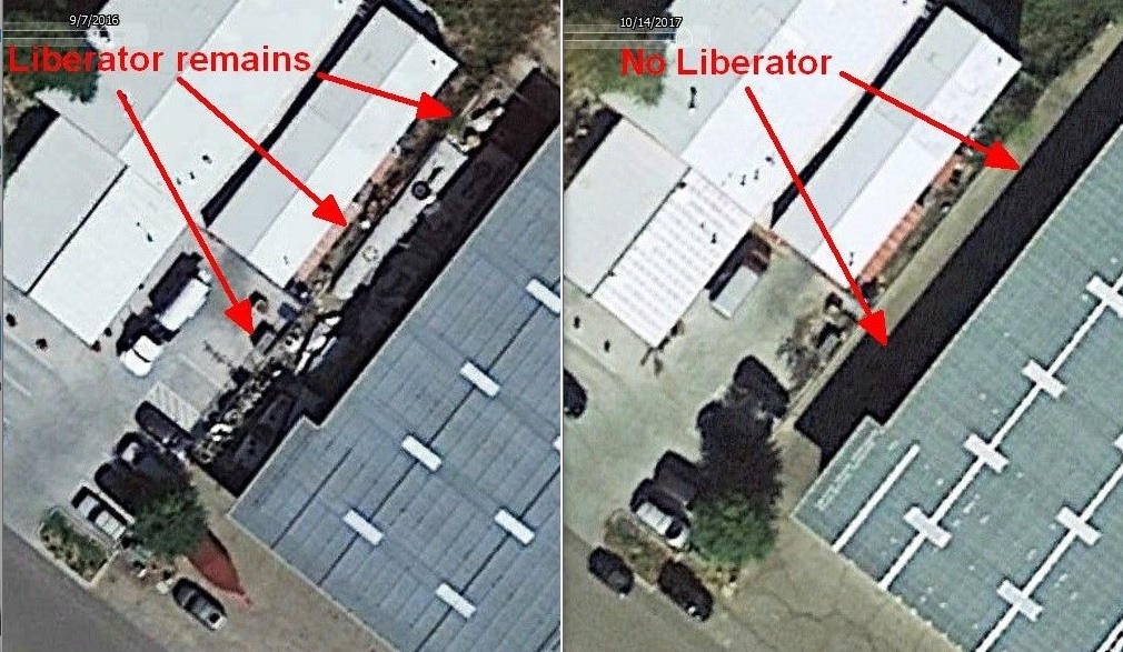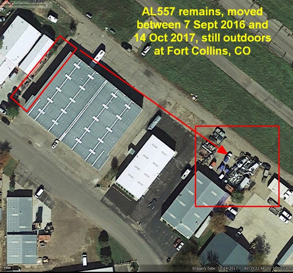 Matt Poole wrote:The remnants of AL557 are no longer in outside storage at Fort Collins, CO. From Google Earth satellite images, Liberator wreckage is seen on Sept 7, 2016, but it has been removed by the next image, dated Oct 14, 2017. I don't know where they are stored currently. The Trade-A-Plane ad says "LOCATION: Utica, FL, USA" - not that the wreckage has been moved there.
