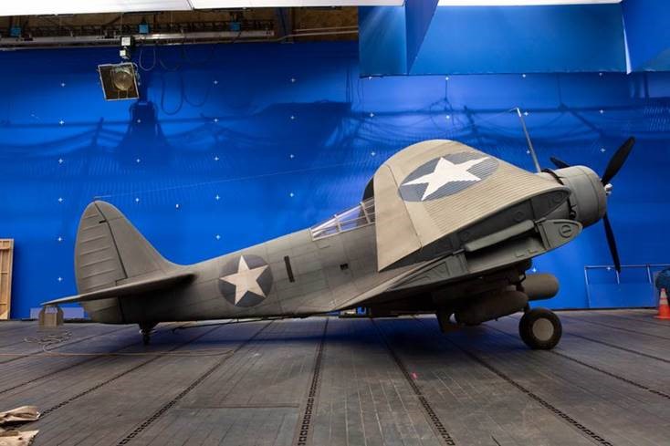 It will be hung behind the Wildcat, to the left of the theater that is in the center of the above photo. This will unfortunately obscure it from easy viewing from a distance, but guests will be able to see it better once they get into the Battle of Midway exhibit, and especially as they prepare to enter the theater.