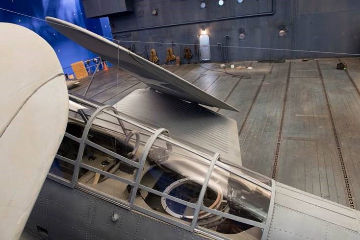 The TBD replica was not donated to the USS Midway Museum. The initial inquiries were about a donation, but by the time negotiations got serious, the studio wanted to make some money back regarding the cost of building the replica. The replica was sold to the museum for an unspecified sum, with the museum also paying for transportation to San Diego from Canada. As the original poster said, it is currently under reconstruction at Hangar 805. However it is due to be transferred onboard the carrier in late September 2019. There final assembly and touch-ups will be done before the aircraft is hung in the museum's Battle of Midway exhibit, joining the genuine F4F Wildcat and SBD Dauntless already hanging there. The aircraft will be marked to represent the number 14 aircraft in Hornet's Torpedo Squadron Eight, which was George Gay's aircraft during the battle. The story of George Gay features prominently in the "Voices of Midway" movie that plays all day long in the exhibit's movie theater, mere feet from where the TBD will be hung.
