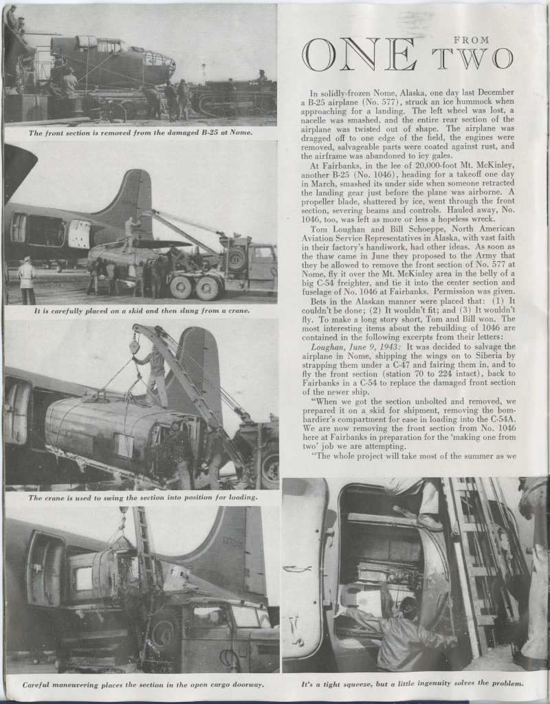 Interesting - don't know where the two plane numbers came from; "577" and "1046" don't seem to tie into any early B-25 serials or c/ns. Checking the AAIR database, the only landing accident in December 1942 involving a B-25 in Alaska was B-25D 41-29752 on December 16th - but that was at Fort Glenn, almost 800 miles from Nome. "1046" is possibly B-25C 42-32253 which was listed as being in a takeoff accident at Ladd Field in Fairbanks on March 23, 1943.