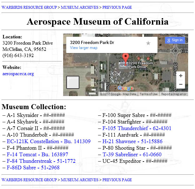 Working on the registry list for Aerospace Museum of California. This is what I have so far. Any help with the missing serial numbers or missing aircraft would be appreciated.