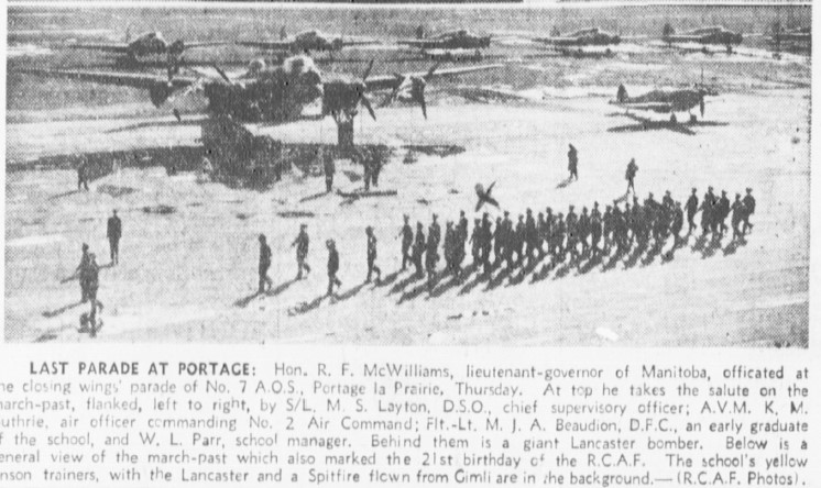 A Winnipeg Free Press newspaper clip from 1945-03-30 showing a Lanc and a Spitfire from 18 SFTS Gimli at the closing of No. 7 AOS Portage la Prairie. I am wondering if the eclipse Spitfire was re-deployed from RCAF Station Rivers to RCAF Station Gimli as Gimli is on Lake Winnipeg and RCAF Rivers is 83 miles from Lake Winnipeg. I cannot think of any other reason for a Spitfire to be at Gimli.