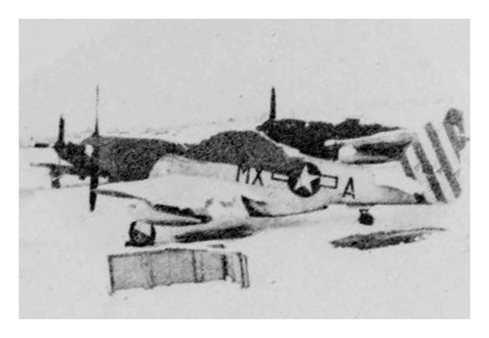 North American P-51D-10-NA Mustang 44-14368 (370th FS, 359th FG, 8th AF) in taxiing accident at RAF East Wretham, Norfolk, England Feb 3, 1945. Pilot survived, aircraft badly damaged, unknown if repaired.