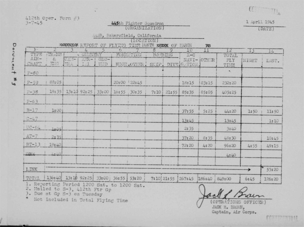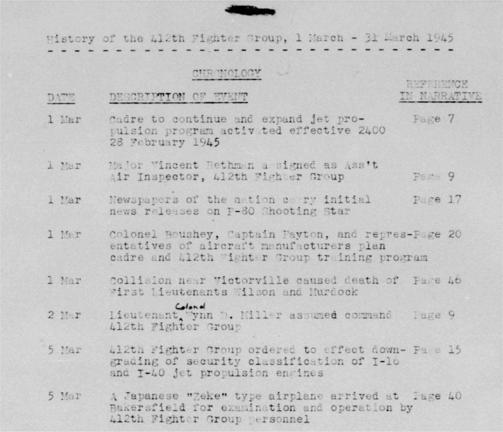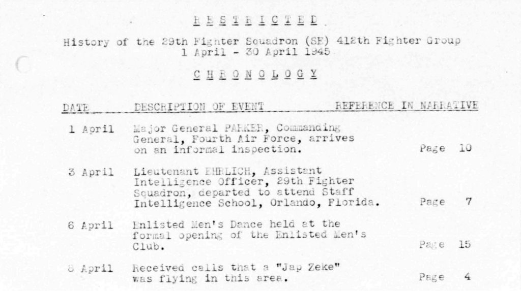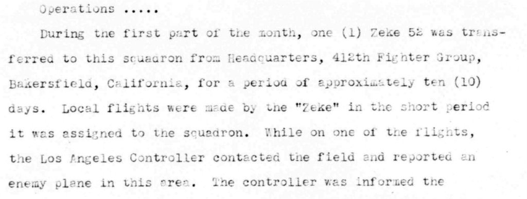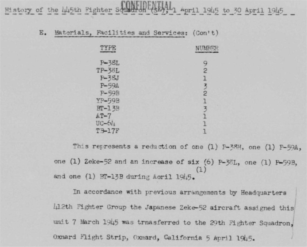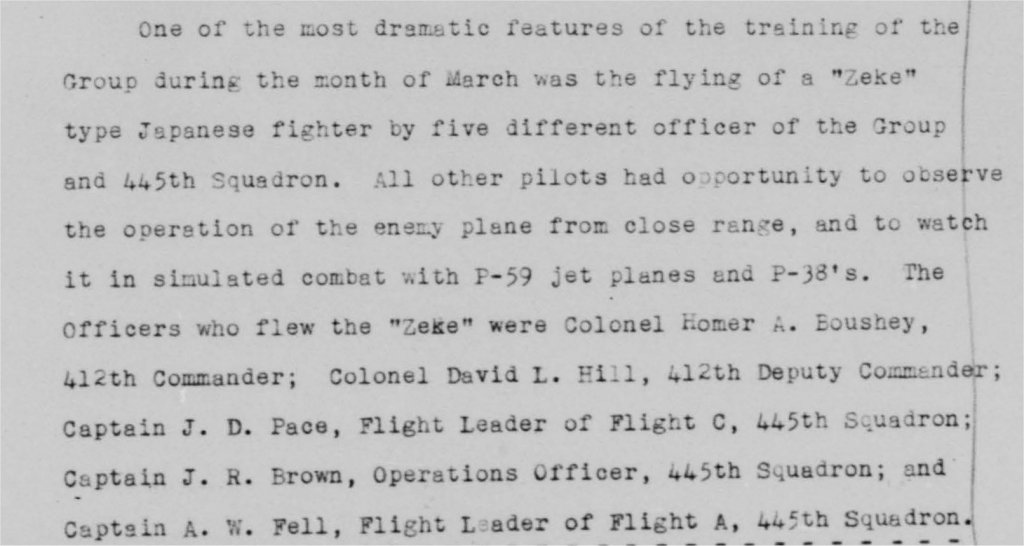 to play with. And it flew simulated combat with the unit's P-59 jets too. The attached records show that the Zero was assigned to Group, where it was flown by several combat veterans, and then transferred to the 445th FS (the first USAAF jet squadron) before a short stint with the 29th FS. Its movements after April 1945 are not known but it seems to have been flown at Eglin around this time too.