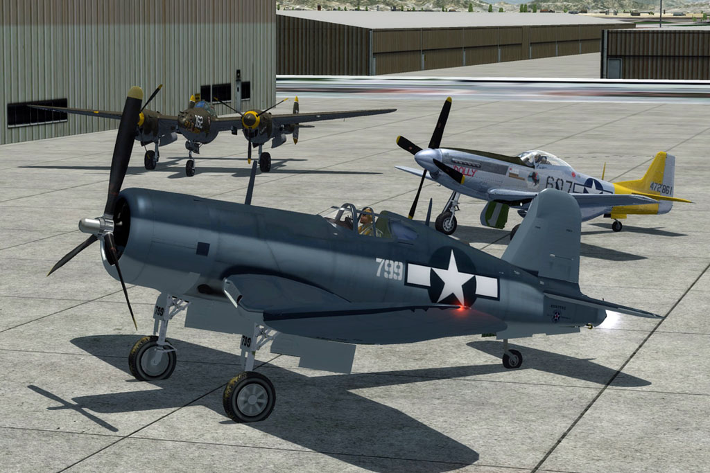 The Corsair above is posed with the POF P-38 (Milviz) and P-51 (A2A) outside POF's navy hangar in a replacement scenery for Chino Airport that is better than the FSX/P3d stock one, but still not good. I've never found a good accurate Chino airport scenery like the ones we can get for other warbird and vintage hot spots like Duxford, Fantasy of Flight, Old Warden, etc.