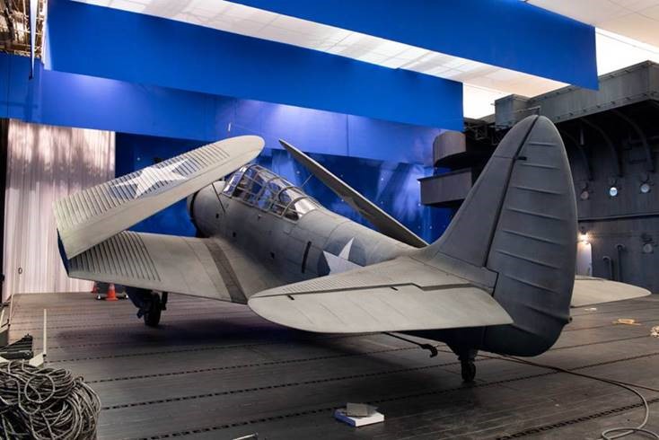 It will be hung behind the Wildcat, to the left of the theater that is in the center of the above photo. This will unfortunately obscure it from easy viewing from a distance, but guests will be able to see it better once they get into the Battle of Midway exhibit, and especially as they prepare to enter the theater.