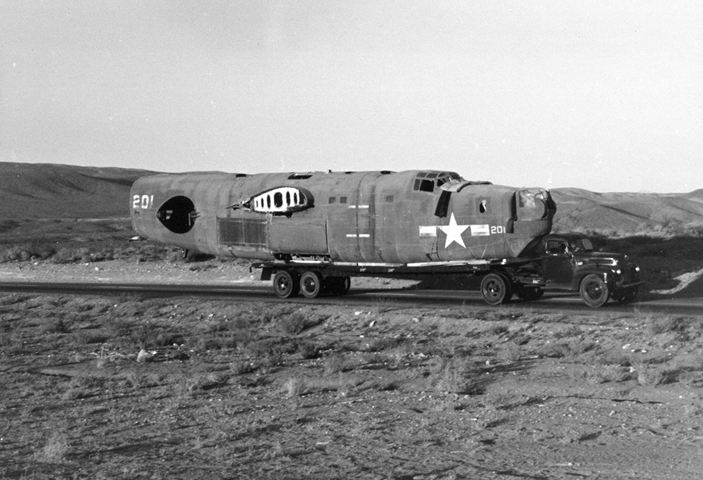 The hulk was transported to the museum’s facility at Ontario, Calif., and was later painted as the B-24 “Lady Be Good.” The attached photo by Milo Peltzer, taken in August 1964, shows the Privateer shortly after its arrival at Ontario.