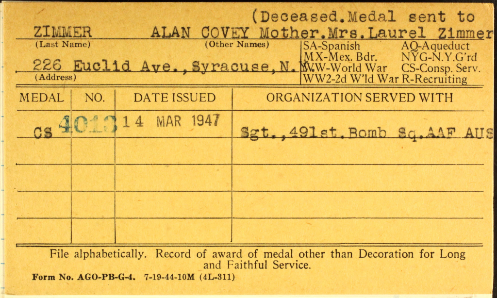 I then turned to Ancestry.com and found that his middle name might be "Covey". This led me to a draft registration card for a Alan Covey Zimmer, born 19 Sep 1920, with a "William Zimmer" of Syracuse, NY, as a "person who will always know your address".
