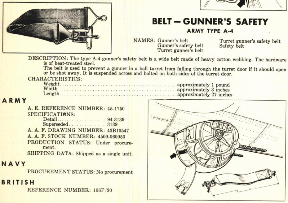 One other interesting aside relevant to the end of the last post: a safety belt, the Type A-4, existed to prevent the ball turret gunner from falling out of the turret if the door was to open in flight: