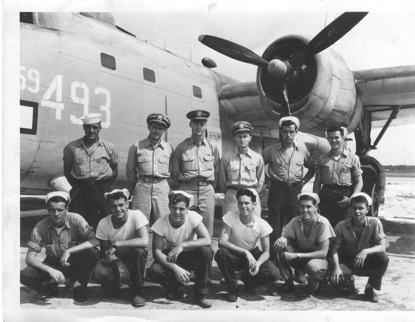 Joe: I want to see that airplane in person someday! I remember seeing Lone Star's Privateer almost complete not long before the flooding from Hurricane Ike goofed up the plans to get it airworthy. I was down there with my grandparents and my grandfather hadn't seen a Privateer since the war and he was very happy to see one in person. I'll have to look through some of my notes at home, but I know he was based in Okinawa and Guam near the end of the war. He tells stories of flying dignitaries to Russia and China. They also flew weather-data-collecting missions in the Privateer. On one flight they intentionally flew into a typhoon for weather-data-collecting and he says they were unable to get out of the vortex for more than an hour. The crew was worried they would run out of fuel before they could get out. He also said they routinely shut down an engine or two to save on fuel on long flights. His airplane was named Sleepytime Gal. Earlier he was in VPB-200 in Kaneohe, then later in VPB-124 in the Pacific. I'm not sure I have enough info or old pictures to determine a Bu. No. for his airplane. But I'll look and see what I have, and maybe request your help, or the help of the forum. See picture attached. My grandfather is second from right on the front row (kneeling).