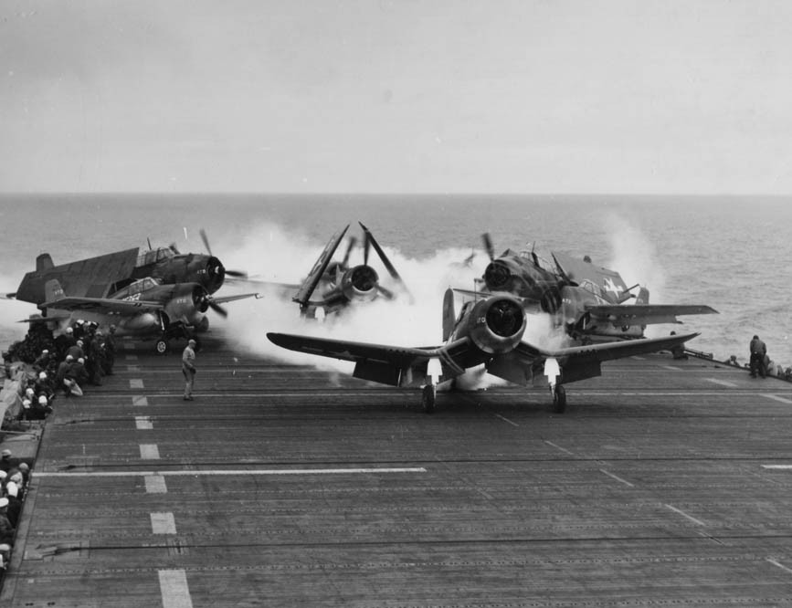 A third photograph shows the aftermath. All but the Hellcat and a previously obscured Dauntless have taken off and the deck of the carrier is covered in a white residue expelled by the JATO bottles.[3]
