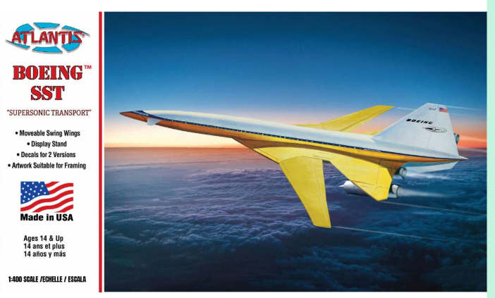 They are re-releasing the Monogram Boeing SST from 1968 and last seen in 1973. It is 1/400 scale and comes with a stand and moveable swing wings (Boeing later revised their design to have fixed wings).
