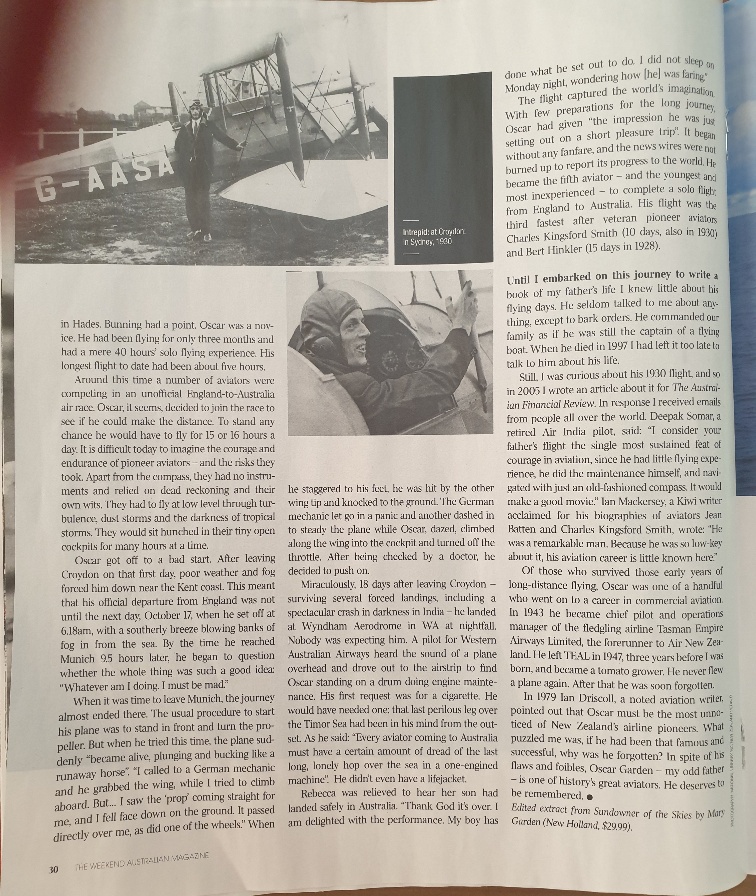 Sundowner of the Skies: the story of Oscar Garden, THE FORGOTTEN AVIATOR. published by New Holland and released in Australia, New Zealand and the UK on 31st May. It is also available from Amazon. There is more information on my website.