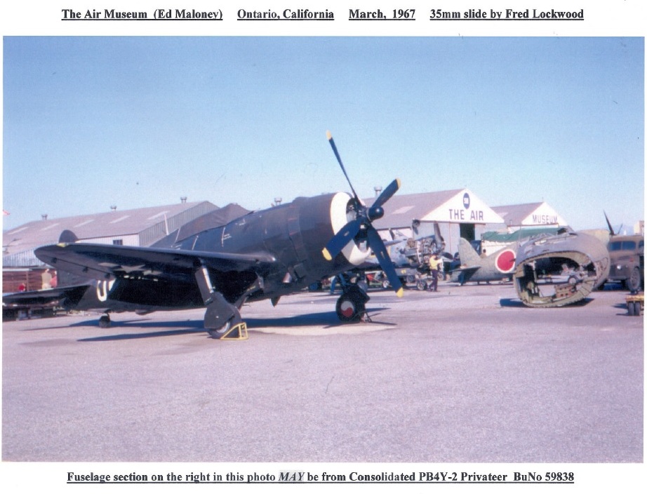 The hulk was transported to the museum’s facility at Ontario, Calif., and was later painted as the B-24 “Lady Be Good.” The attached photo by Milo Peltzer, taken in August 1964, shows the Privateer shortly after its arrival at Ontario.