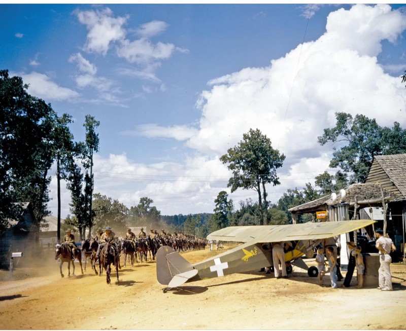 A popular image of the maneuvers is this rare color photo of an Piper grasshopper getting fuel at a rural gas station as horse mounted Cavalry rides past.