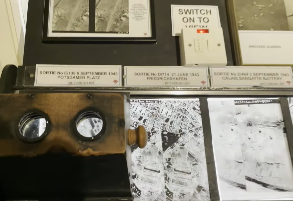 The final one is a stereoscopic viewer mounted on a set of rails that allows visitors to slide it left and right to interpret a series of aerial reconnaissance photos for themselves: