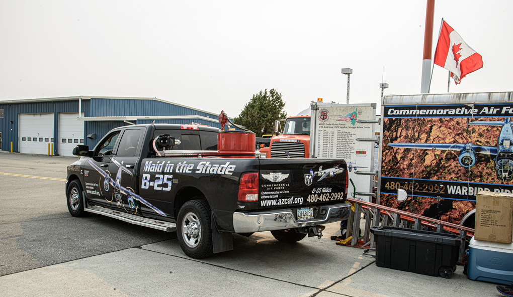 Turns out the Sentimental Journey tour is not only happening, but touching down in places like this. I stopped by the airport at the end of the day, and had a great time talking Warbird with the various crew and support people. The tour is a much bigger operation than I would have imagined, with a couple of trailers and tow vehicles to support the two Warbirds.