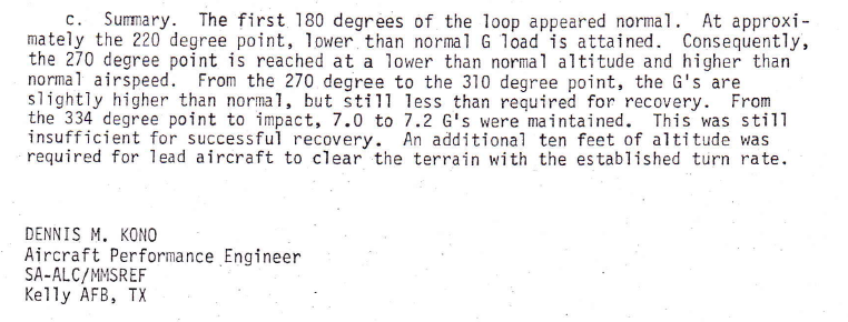 The initial report of the board was a finding of pilot error. The lead aircraft had topped out on the loop at an altitude below the minimum required to insure a safe recovery. Failure to recognize the altitude