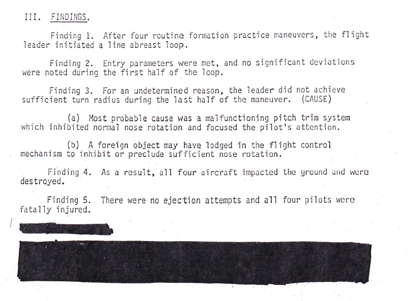 When the report was submitted, General Creech returned it and reconvened the board with the statement that "Thunderbirds do not commit pilot errors." Command guidance was to come up with another cause.