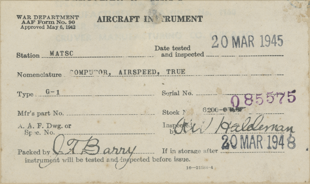 Similar to the example mentioned in a previous post, this example was also found on the outside of a G-1 flight computer box. Note that both were packed by the same individual!