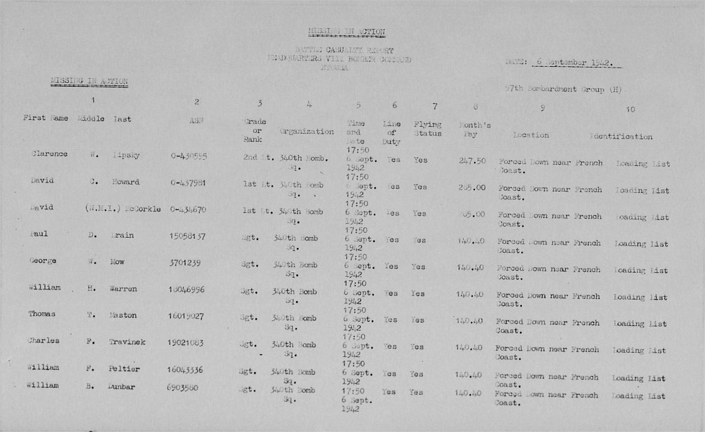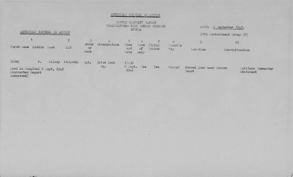Regarding Baugher's entry, the 97th mission on 6 September 1942 was to the Potez factory at Meaulte and no aircraft were lost. The only casualty was the tail gunner in '9021 (Cpl Bungard), killed by enemy gunfire.