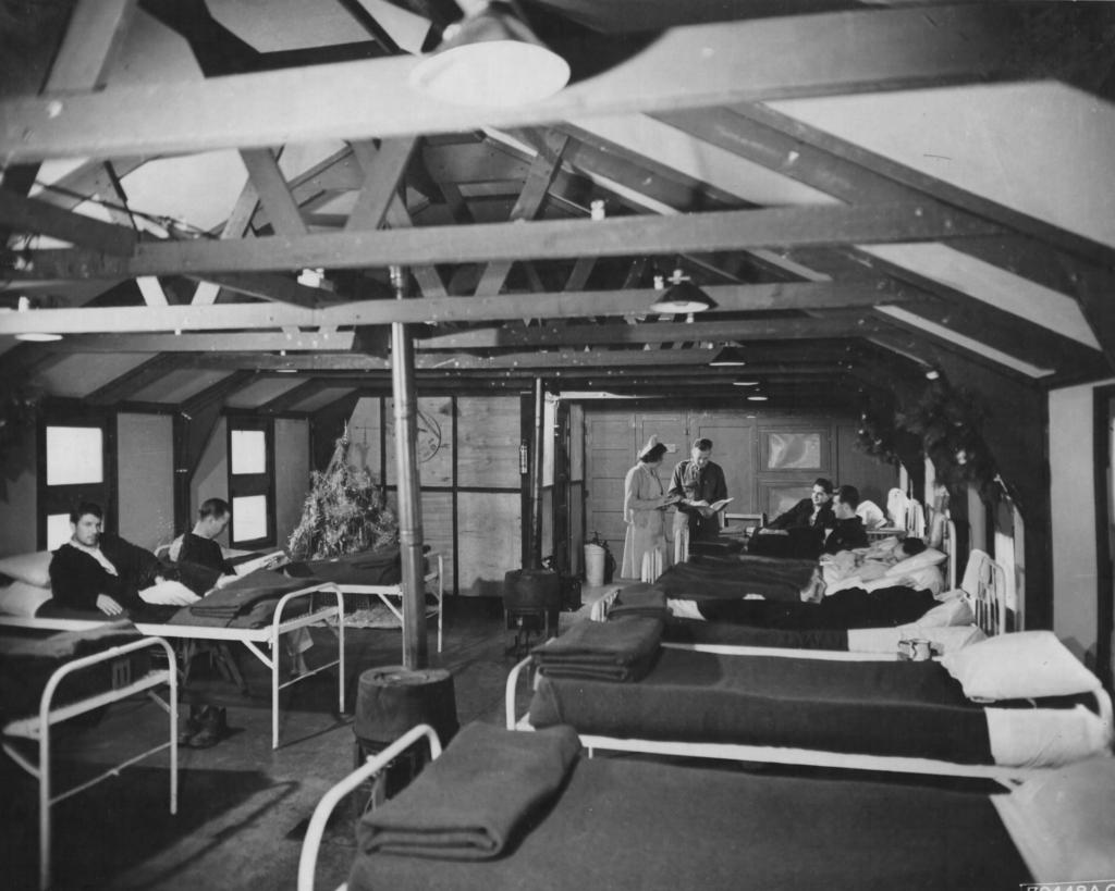 A Christmas tree adds a note of cheer to one of the wards in the Poltava Airbase hospital 24 Dec 1944