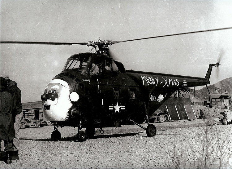 HMR-161 dressed up their HRS-1, Bureau Number 127789, before delivering presents to a nearby Korean orphanage and hot meals to troops near the front lines - Christmas 1952.