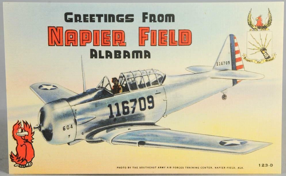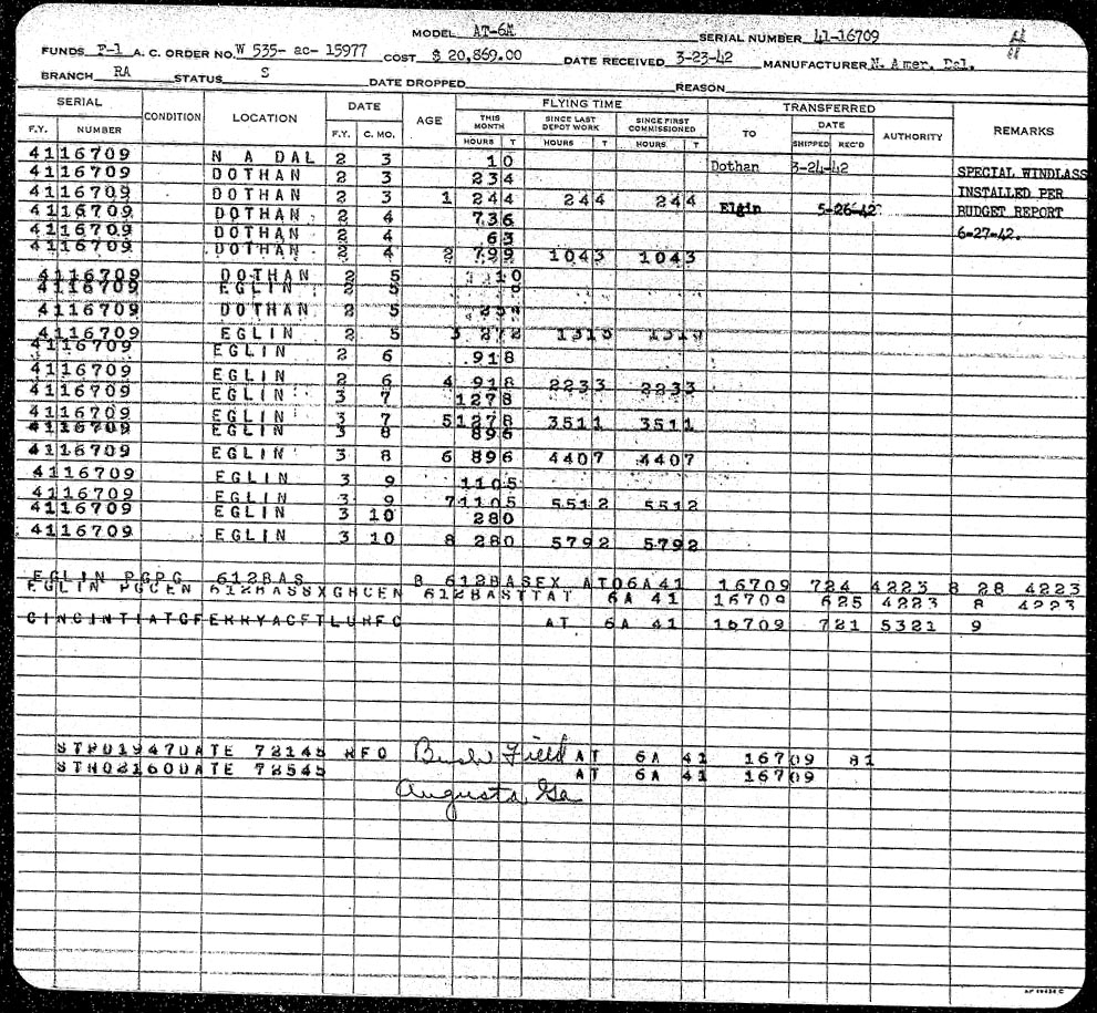 Was given the gift of a vintage postcard, "Greetings from Napier Field Alabama" with an image of 709 by my wife who grew up in that area. This serial is not covered in Baugher's list but an accident website shows it involved in a "ground collision" at one of the Eglin aux fields in Florida in 1945. Curious if the WIX braintrust can add any more to the story of this AT-6.