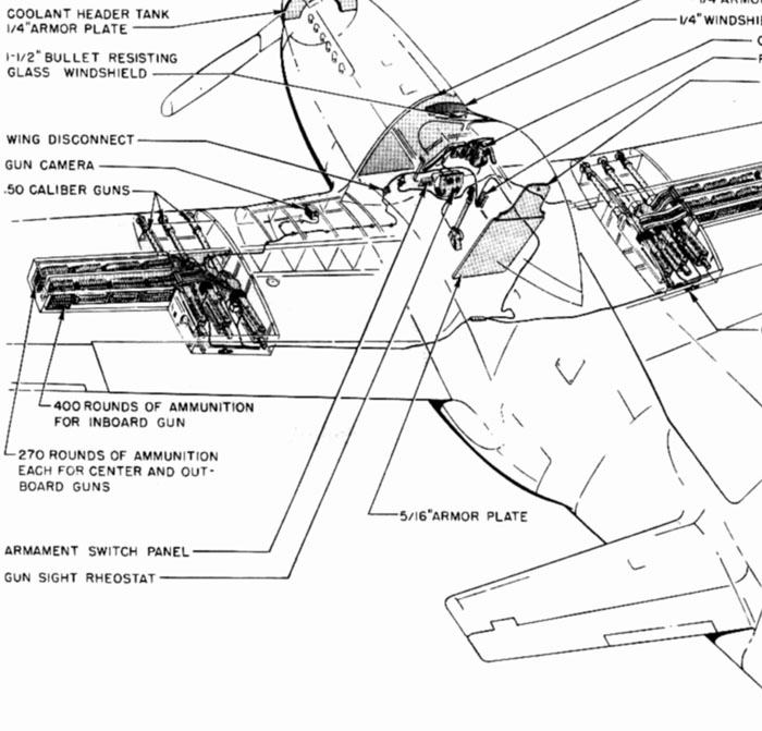 Either of two gun installations is possible: (1) three fixed .50 caliber guns may be installed in each wing, with 500 rounds (400 in late airplanes) of ammunition for each inboard gun and 270 rounds for each center and outboard gun; (2) the center gun may be removed, allowing the inboard guns to carry 500 rounds (400 in late airplanes) each and the outboard guns to carry 500 rounds each.