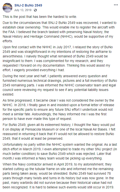 VCS1 wrote:I was the owner involved with the scrapping of SNJ-2 BuNo 2549. As Taras as elaborated, the NHHC began negotiations in earnest then increasingly added more terms and conditions that were difficult to comply with. That is why I finally relinquished the wreckage to what I believed would be placed into storage. In my situation, I never was informed the ultimate disposition would be scrapping.