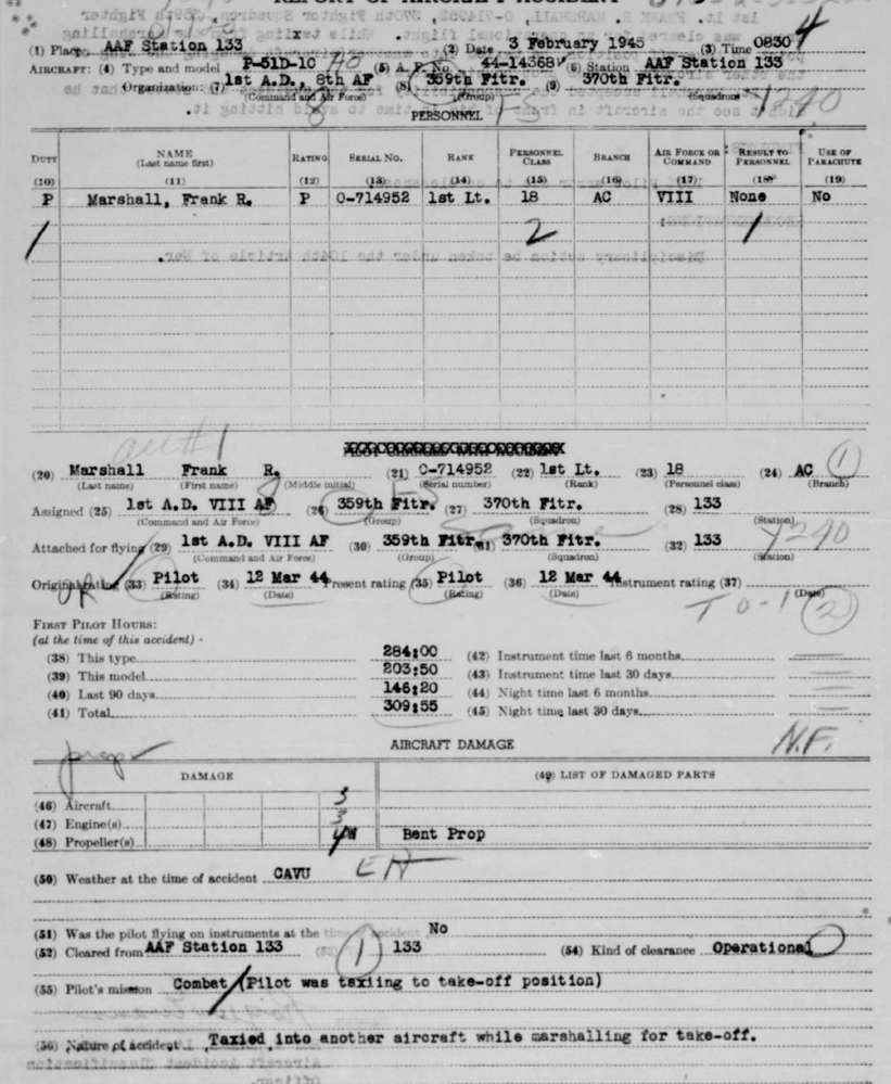 North American P-51D-10-NA Mustang 44-14368 (370th FS, 359th FG, 8th AF) in taxiing accident at RAF East Wretham, Norfolk, England Feb 3, 1945. Pilot survived, aircraft badly damaged, unknown if repaired.
