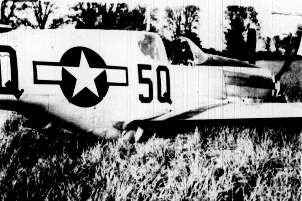 North American P-51D-5-NA Mustang 44-13704 (3745h FS, 361st FG, 8th AF, "Ferocious Frankie") crashed during wheels up belly landing on takeoff at RAF Great Little Walden, Essex, England Nov 9, 1944. Pilot survived.
