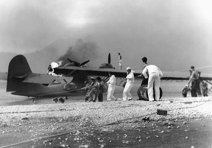 The Japanese knew that these planes could track them to their carriers north of the island. The PBY-5s had a range of almost 1,500 miles and could be in the air in minutes. So, just before the general attack, at 7:48 a.m., attacking planes strafed the Naval Air Station with 20 mm incendiary rounds and bombs. Of the 36 planes there, three were out on patrol, six were damaged, and the rest were destroyed. Servicemen at Kaneohe Bay scrambled to put out fires and salvage what they could.