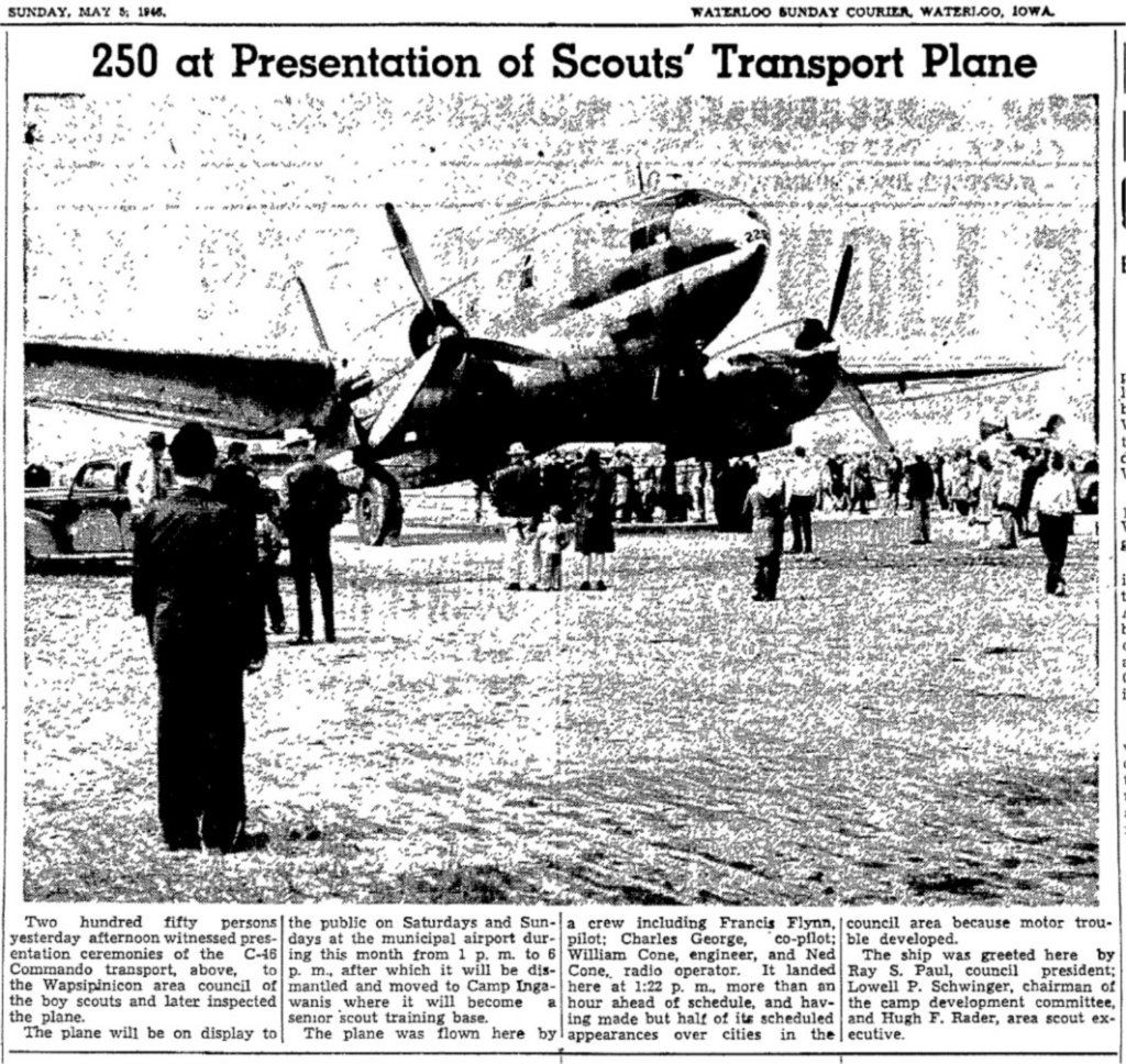 I don't know if this is the same aircraft, but a C-46 was purchased in March 1946 by the Wapsipinicon Area Council of Boy Scouts for use at Camp Ingawanis near Waverly, Iowa. The C-46 had been in storage at Walnut Ridge, Arkansas and was sold to the scouts for $200.00. It was delivered to the airport at Waterloo, Iowa on May 4, 1946 and after being on display was to be disassembled prior to being transported to the camp. In June the scouts were seeking volunteers to help disassemble the C-46, and reassembly was completed in May 1947. The C-46 was to be the permanent headquarters for senior scouts and outfitted with bunks and accomodation for 20. It was advertised for sale by the scouts in March 1949, to be junked.