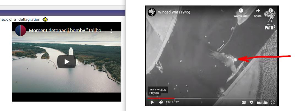 and if you look carefully I think that wartime raid film shows this very Tallboy making a splash in water, as there is a splash that is a lot smaller than the other Tallboys that clearly explode, and its a big enough splash to be a 12000lb Tallboy hitting the water and not going off.....and if you freeze frame both films and screen shot it, it does look very close to being the same one....splash indicated by red arrow.