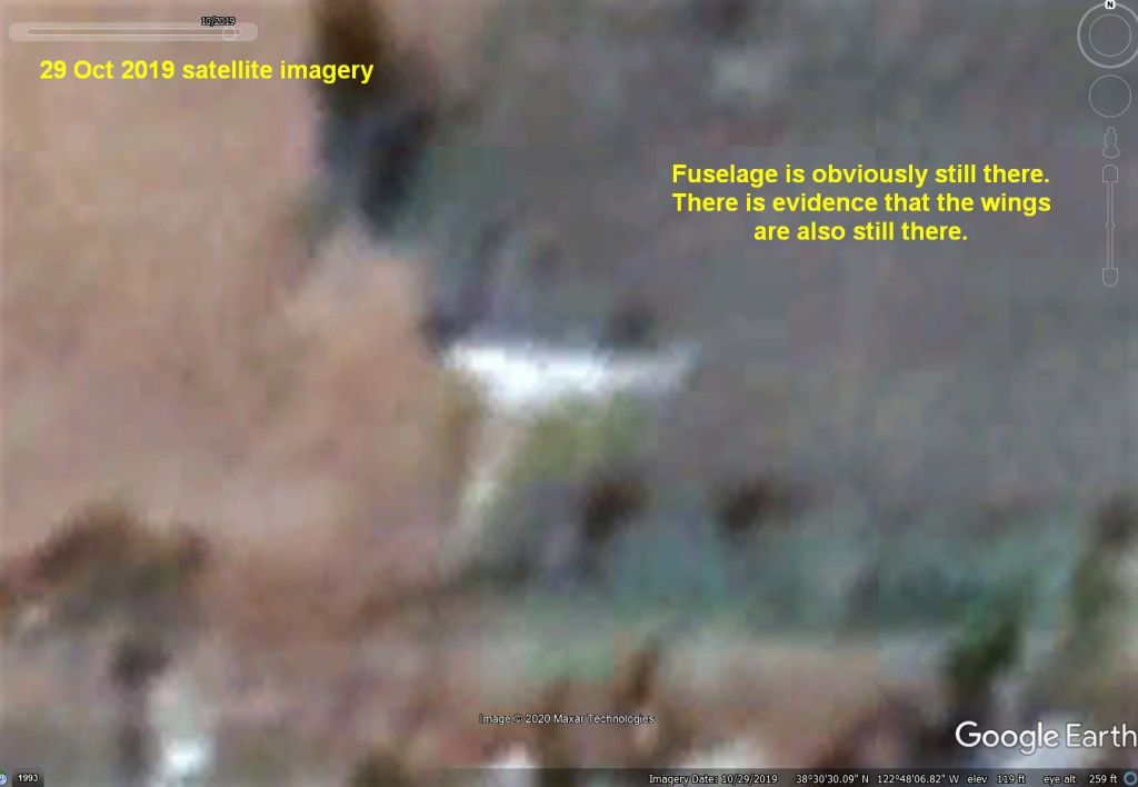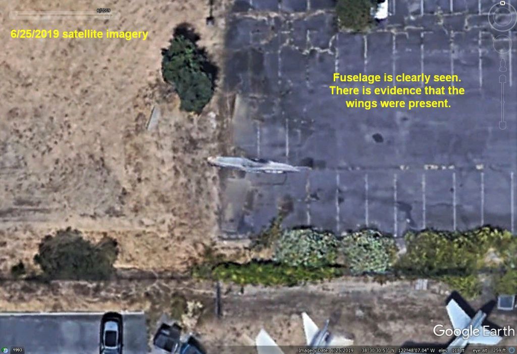 On Google Earth I saw the satellite view you posted, dated 6/25/2019. On first view, it appears as if only the fuselage was there, and that the wings were missing, but comparisons to other GE satellite imagery, before and after that date, indicate that the wings were still there on 6/25/2019. It is especially obvious when comparing the 6/25/2019 satellite imagery with the next-earlier GE sat imagery, dated 9/19/2018. (Whoever prepared the 6/25/2019 imagery for GE faded this imagery in this area, as it merged with another satellite shot, presumably. The fuselage is still noticeable, but the wings are harder to see.)