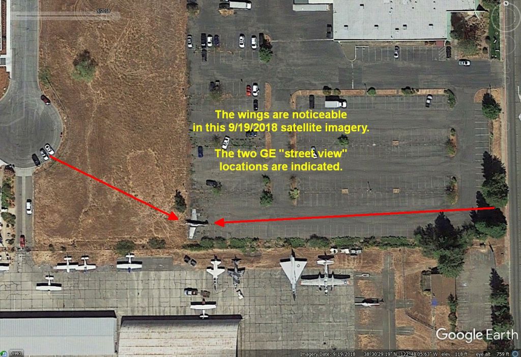 I went to “street view” and was able to see the aircraft from two vantage points on the ground. The wings were definitely sitting on the ground. The street view imagery (for each view I've attached) is simply dated 4/2019.